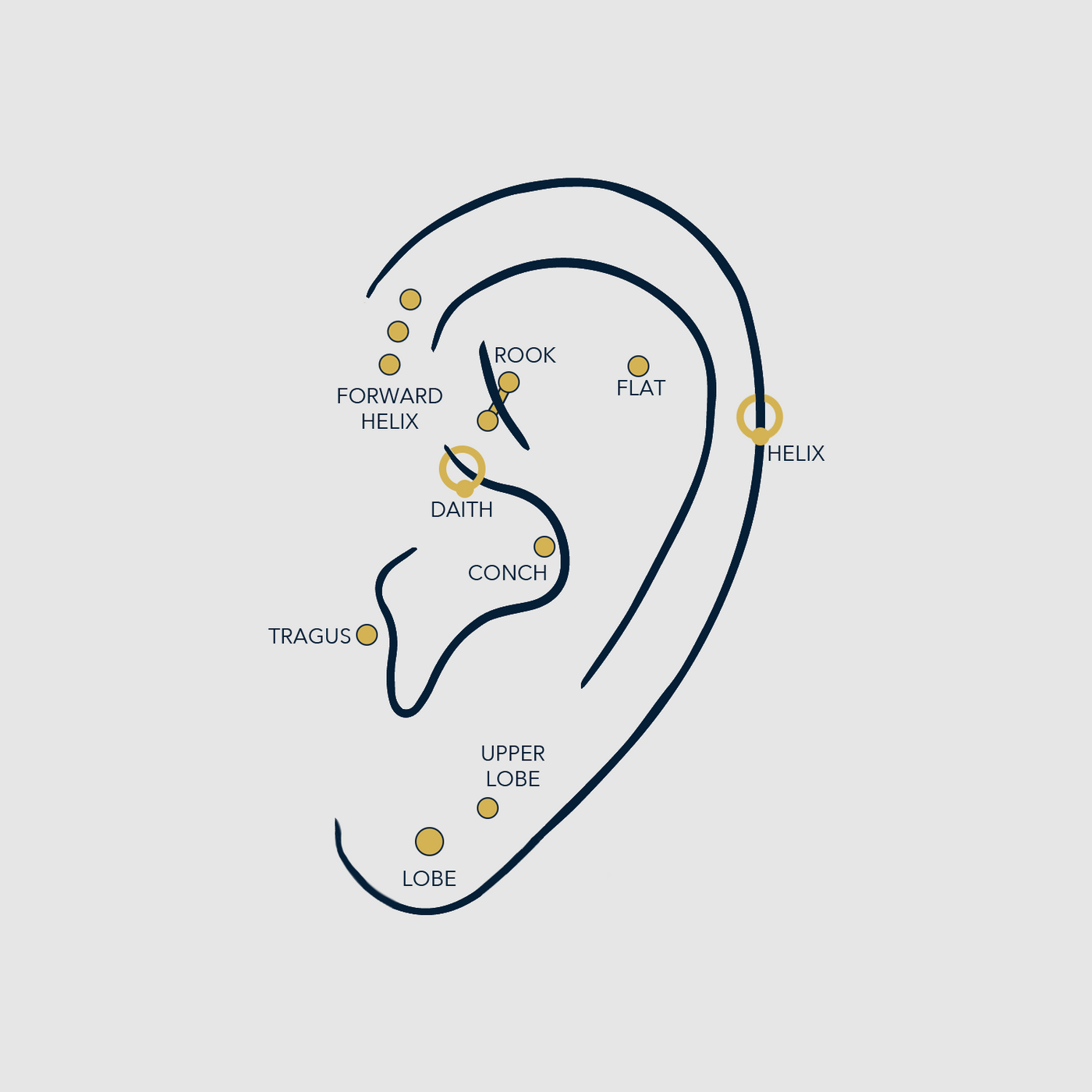 The Daith: found closest to the ear canal, at the end of the helix. The Conch: passes through the shell-shaped structure of the internal ear. The Tragus: found in front of the ear canal and connects to the face.