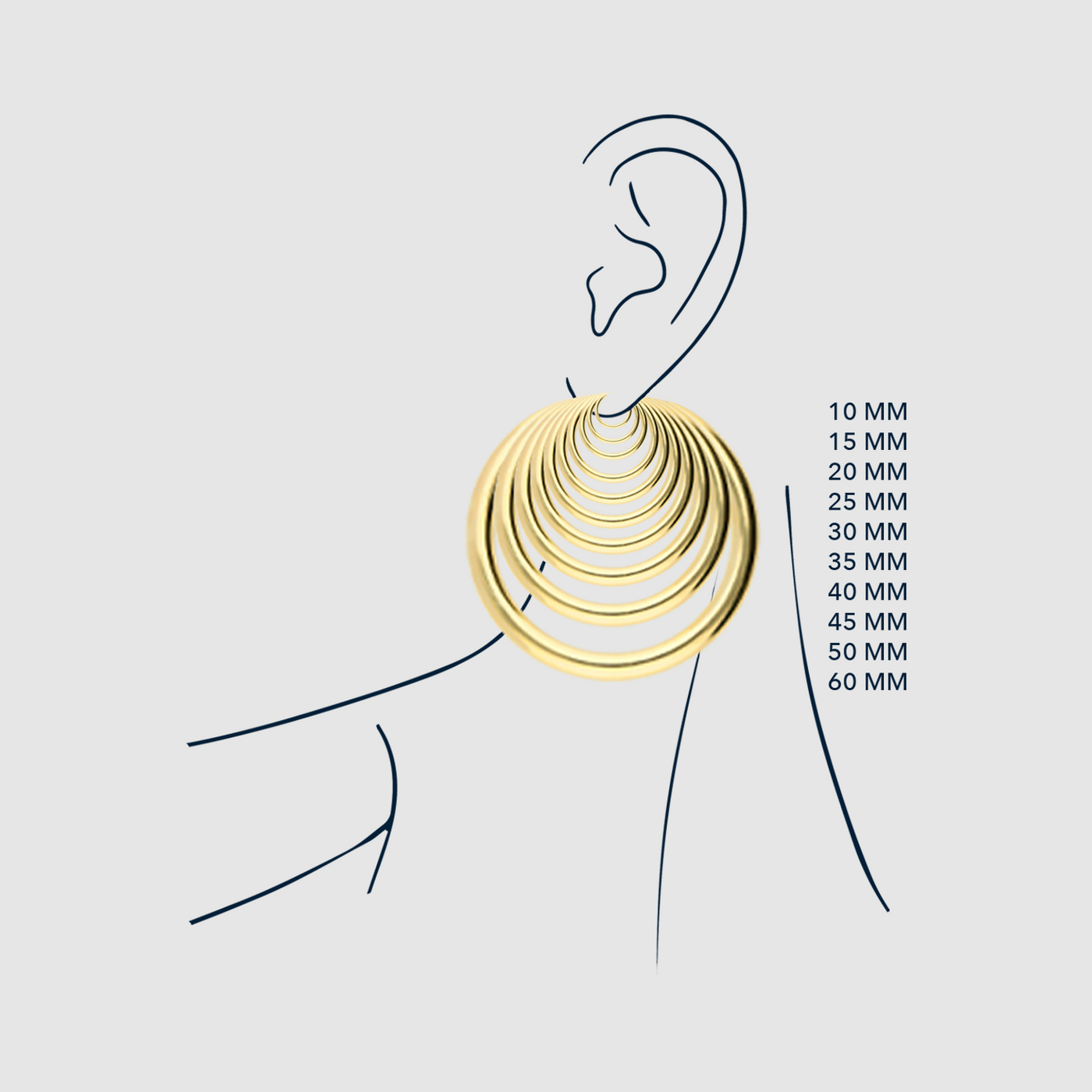 Hoops come in a variety of different sizes, from as small as 7mm, too as big as 70mm, and even larger. To give you a visual guide of where different size hoop earrings could fall from your ear, we have created a template showcasing a range of sizes from 10 to 60mm. Every earring is measured in millimetres, along the inside diameter of the hoop.