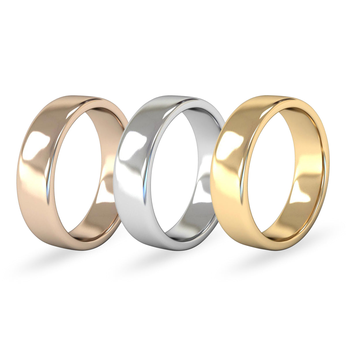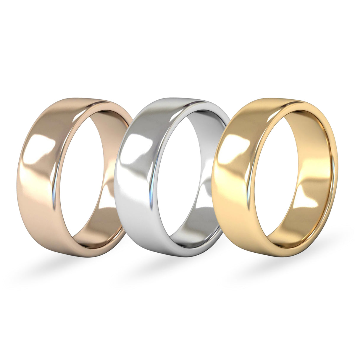 Using 100% recycled metals, the slight court with a flat edge wedding band can be manufactured in a variety of different metals, widths and weights. If you would like to add a personal message, special date or name into your ring, engraving is available for these wedding bands.